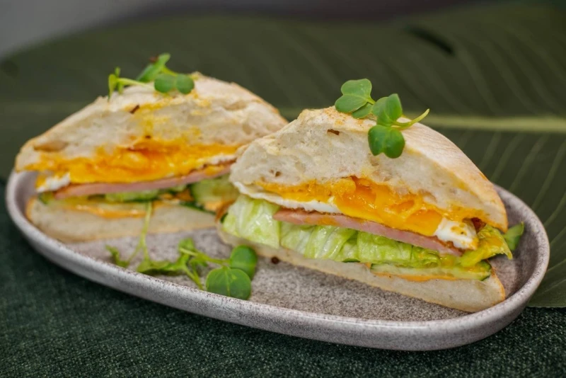 Погрузитесь в гармонию вкусов с нашим аппетитным сэндвичем — нежное яйцо и диетическая ветчина из индейки гармонично сочетаются с хрустящим айсбергом, сочным огурцом и тягучим сыром. Этот сэндвич станет идеальным выбором для лёгкого, но сытного перекуса